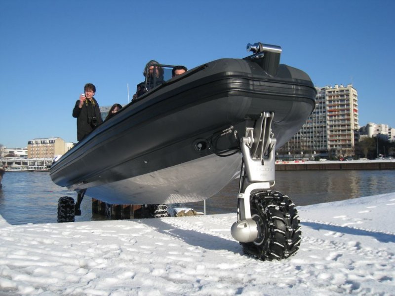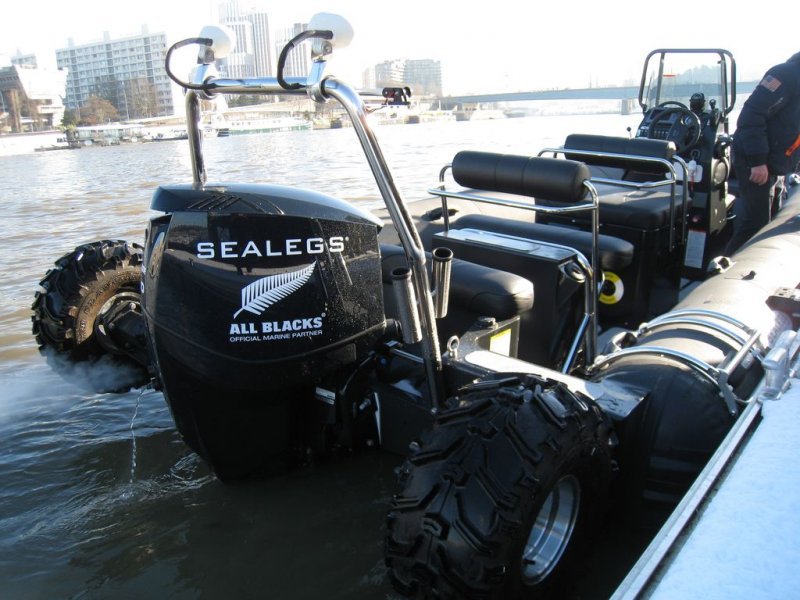 Le Sealegs est un semi-rigide amphibie doté d’une coque aluminium et d’un système à trois roues motorisées, retractables hydrauliquement et orientables.