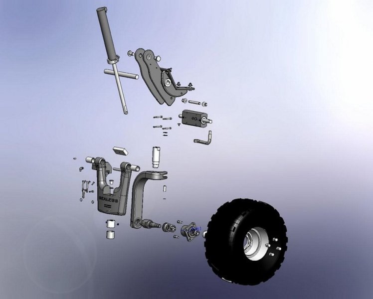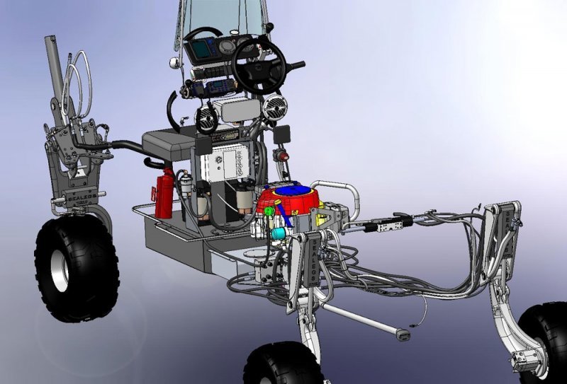 3 roues puissantes entraînées par une pompe hydraulique embarquée. Les roues arrières et la roue avant sont chacune retractables par un verrin hydraulique et, tandis que les roues arrières sont statiques, la roue avant elle, est directrice.