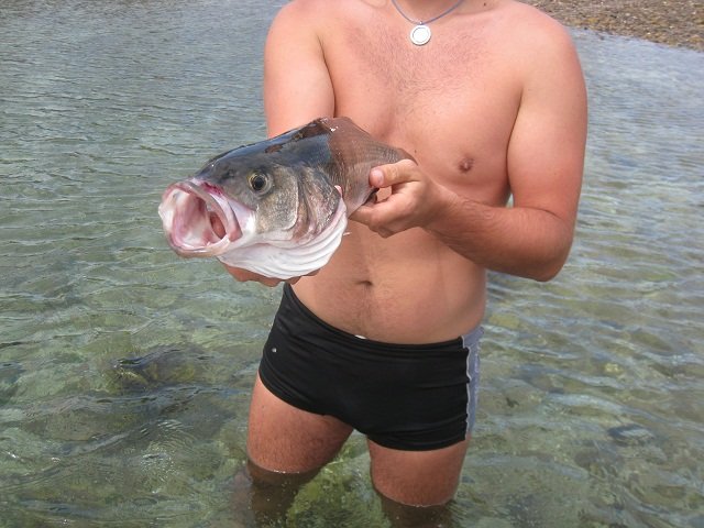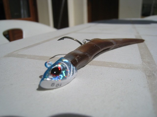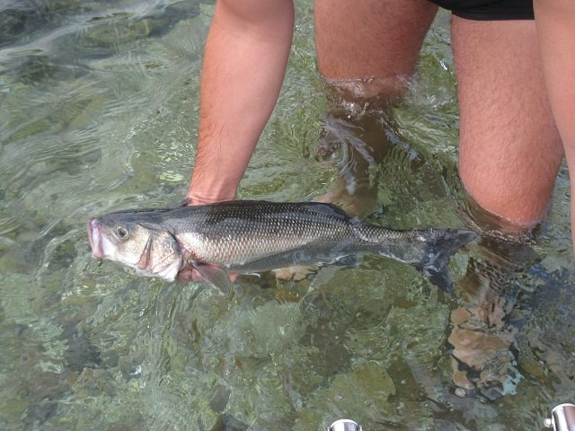 Par 7 mètres de fond et après une petite demi-heure de pêche je prenais ce beau bar de 47 cm avec un Mister Twister gris/marron + tête plombée Powerjig de 10 grammes.